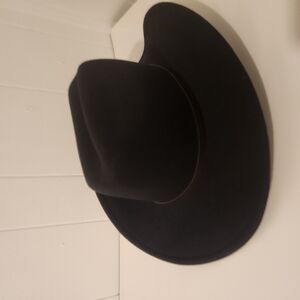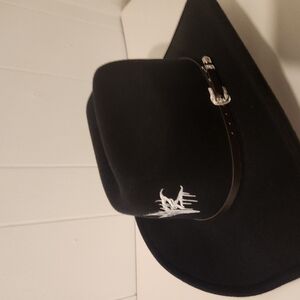 This classic cowboy hat features a sleek black design with a striking white logo on the front, offering a timeless western style. Crafted from high-quality felt, it boasts a traditional curved brim that adds a touch of rugged elegance to any ensemble.