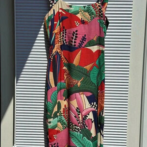 Dress hits just below the knee but has a slit that goes above the knee on one side.
