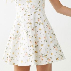 A knit mini dress featuring an allover floral print, mock-button front, princess seams, soft V-neckline, self-tie cami straps, paneled construction, and a fit and flare silhouette.