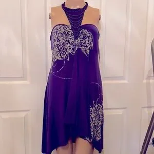 Free People purple tie halter dress with metallic beading and chains on bodice. Elastic on back sz L