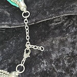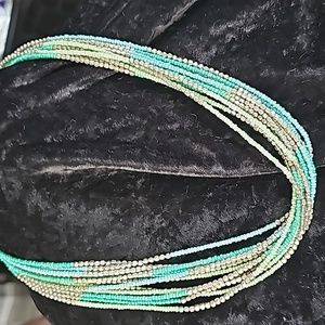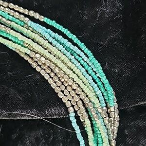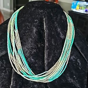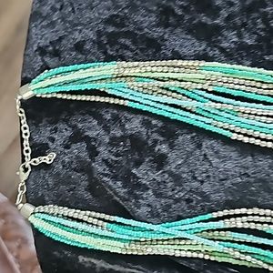 Beautiful native american Indian Necklace. Turquoise color beads, light green beads, silver beads. 13 strans on Necklace with Silvertone extender.
