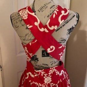 Red and White, taffeta, red and white, X strap back, side zipper, drop waist, gather skirt, one layer of tulle with ruffle hemline inside, junior party dress.