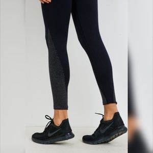 These leggings are decorated with just the right amount of subtle details. Using seamless technology, this pair is woven with unique shimmery stripe blend for the high waist band that as well as accent on the lower leg that glitters as it catches light.