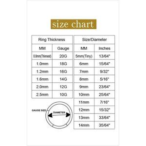 Color & Size Options: Available in silver, black, gold, rainbow, blue, and rose gold. Sizes include 20g, 18g, 16g, 14g, 12g, 10g, and 8g, with inner diameters ranging from 5mm to 20mm.