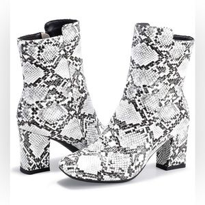 Faux snakeskin booties, good condition, only worn once!! There is some damage to the left heel (pictured), price has been adjusted accordingly.
