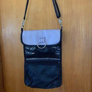 Lavender Faux Leather; 3 generous, zip compartments; fully adjustable shoulder strap, fold-over magnet closure. Never used! Like new condition.