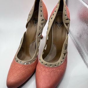 Gorgeous peach heels with leather soles. Size 9 1/2. Gorgeous tan leather trim. Gorgeous shoes in excellent condition. Slight wear.