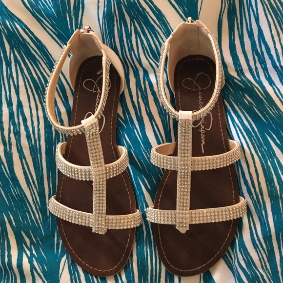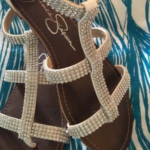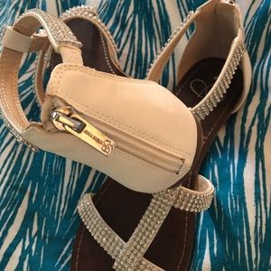 White leather rhinestone flat sandals with zipper back. Worn once for wedding after party!