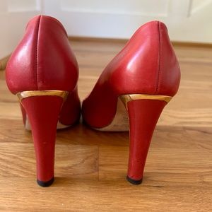Four-inch Jimmy Choo closed-toe heels with subtle yet stunning gold accents. Size 37 (7). No scuffs or signs of wear on the leather or heels. Perfect pair of heels.