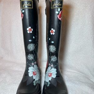 Embrace the elements with Joules' stylish black winter rain boots, designed to keep your feet dry and comfortable. These boots feature a sleek, glossy finish and a sturdy sole, perfect for navigating wet and slippery conditions. With their classic design, they are an essential addition to your winter wardrobe.