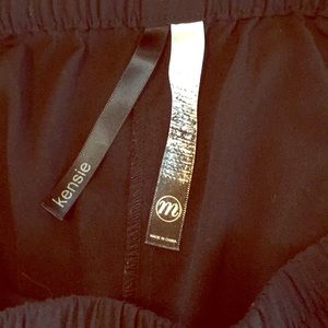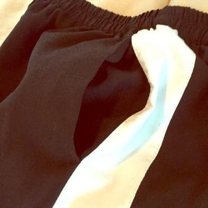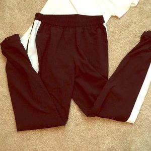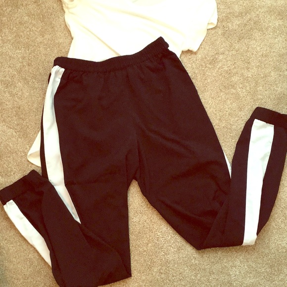 Silky, pull on track pants with elastic waist and ankles. Fabric content tag removed, but they feel like a polyester blend. Washable. Light wear-no snags, stains or holes. Comes from nonsmoking home.