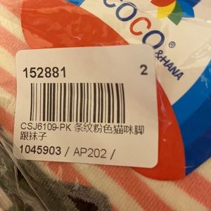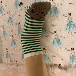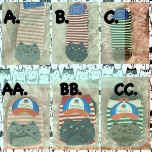 These ladies size lightweight ankle socks feature an adorable kitten face over the toes with embroidering facial features the body of the sock has varying colors of stripes and a matching body color on the heel these adorable socks can be had for a single pair price of f$5 or mix-and-match 2 of any color for $8.00. 3 colors available. All fit ladies 4-9.