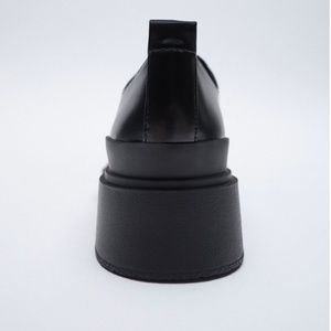BLACK LOW HEELED DERBY SHOES. BACK PULL TAB. LACE CLOSURE.