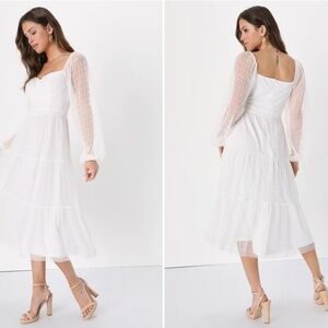 $88 Retail LULU's Bridal Shower Reception Swiss Dot Romantic Flowy Long Sleeve Bustier Midi Dress NWOT