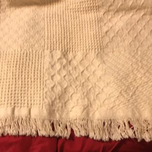 This is an ivory colored throw with a textured design including various honeycomb designs and waffle weave. It is an estate piece but is in mint condition. I am not sure of the fabric but it seems like a heavy duty thick cotton. It is quite heavy and would be very warm.