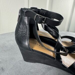 Lucky Brand Black Leather Wedge Strappy Sandals Womens Size 10