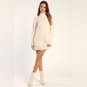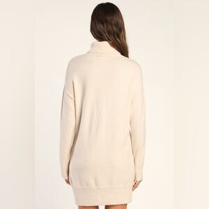 Pickup a warm bevvy and embrace the changing season in style with the Lulus Frosty Forecast Cream Turtleneck Long Sleeve Sweater Dress! Ultra soft and cozy sweater knit shapes a chic turtleneck that flows into a contrasting, triangular ribbed knit detail. The relaxed silhouette is framed by long sleeves and ends at a flirty hem. Ribbed knit accents the cuffs and hem.