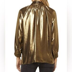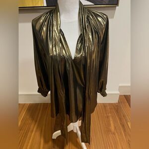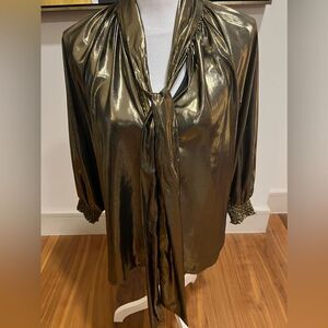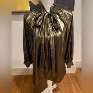 MISA LA Consuela gold blouse, it can be tied at the neck or looped or untied, fully lined, metallic, this has never been worn. It still has the plastic tag, size S. I also have the same shirt and an extra small as well in my closet.