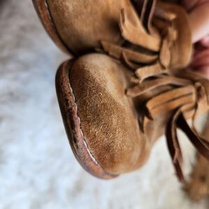 brown suede fringed western style mule. Preloved condition. All sections of interest as well any known flaws have been documented in the photos and noted as thoroughly as possible. if there are no known flaws, none will be noted. Please feel free to ask any questions before purchase 🙂.