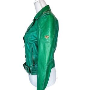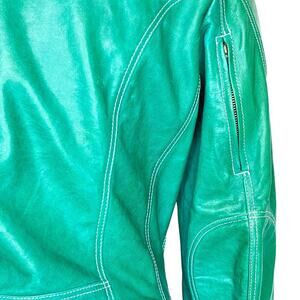 This vibrant leather jacket 100% real leather, this jacket is absolutely stunning, perfect for fall and winter seasons! The green color is sure to make any wardrobe and outfit pop! Matchless is a Long based brand, famous for their quality leather jackets! Notice some wear and tear on the jacket, and discoloration.