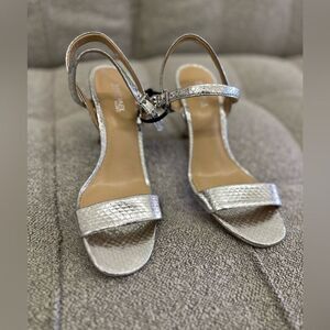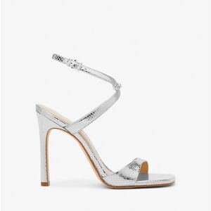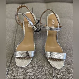 New , No Box!!!! These Michael Kors silver heels feature a sleek stiletto design with shimmering straps that elegantly wrap around the ankle and toes. The minimalist yet glamorous style makes them perfect for formal events, adding a touch of sophistication to any outfit.