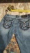 Trendy distressed blue jeans with unique stitching. Perfect for casual wear.