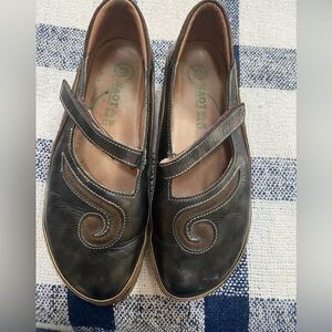 This signature leather and suede shoe has a cork and latex footbed which contours the foot for lasting comfort. Has a adjustable hook and loop .Little wear on nose, see picture. Made in Israel. Size 38 which converts to a size 7. These have some light wear but still a lot of life left.