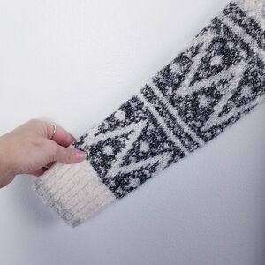 This is a stunning Joie Long Duster Cardigan Sweater with nordic and fair isle vibes. Features cream background with gray hem, cuffs, collar and gray diamond shaped pattern with black and gray fair isle-like pattern in middle. Super cozy - wear instead of a jacket or layer over long sleeves in winter and over cami or tank when transitioning to spring or fall. A wonderful versatile piece for any closet.