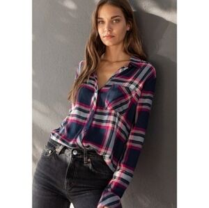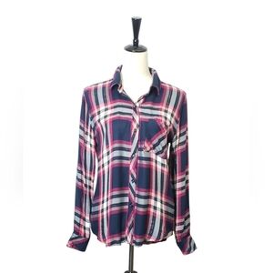 This is a classic Rails Button Down, NWOT, in the colorway of Fushia, Pink, Navy, with a metallic gold subtle stripe. "THE HUNTER IN FUCHSIA PINK & NAVY BY RAILS. A CLASSIC LONG SLEEVE PLAID BUTTON-DOWN FEATURING METALLIC GOLD THREADING DETAIL AND SINGLE CHEST POCKET AT FRONT". Bust measures approximately 19" flat, length is approximately 26.5" from shoulder to hem. In perfect unworn condition.