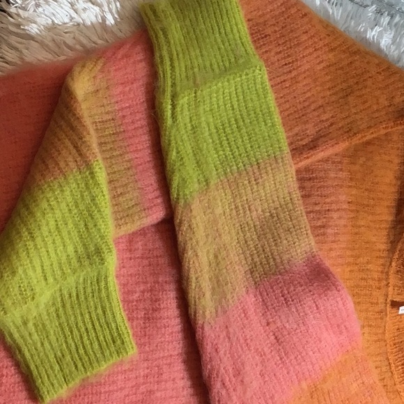 Such a pretty piece for the season! Angora look and feel, the coral and pink with greenish yellow is sooooo cool. You will love it!