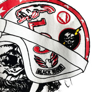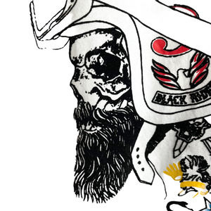 Profile of bearded face with helmet 'Black Rider" and tattoos on neck