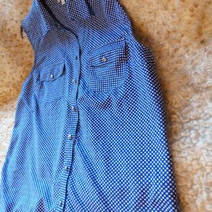 Chunky Silver Buttons/ two front chest pockets. Collared button down, sleeveless shirt. Side slits. Long tunic. Color navy blue and white.
