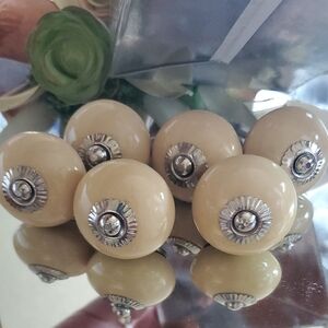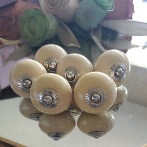 Set of cream knobs with silver accents. Perfect for cabinets or drawers.