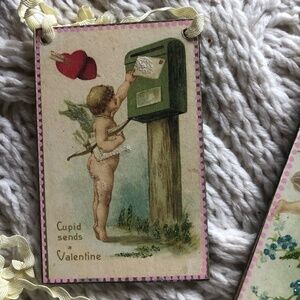 COPY - PRIMITIVE WOODEN SET OF 4 WOODEN CUPID VALENTINE HANGING POSTCARDS