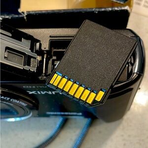 Camera in original box, charging cord, SDHC card, original battery, and carrying case.