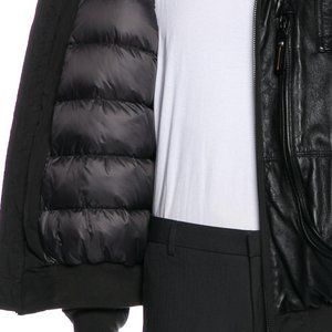 Down filled bomber in polyester micro ottoman combined with goatskin leather. The twill fabric has a water resistant treatment to withstand water. Drawstring hood with detachable real fur trim and a faux fur lining. Multiple pockets: cargo pocket in front and a small pocket on the left sleeve, as well as an inner zippered pocket. Ribbed-knit cuffs and hem. Two-way front zip and PJS snap-hook at the neck. PJS patch on the left sleeve.