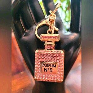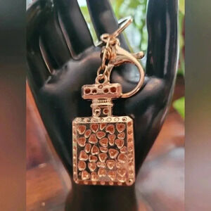 Elegant perfume bottle bag charm. Features pink rhinestones. Iconic perfume bottle design.