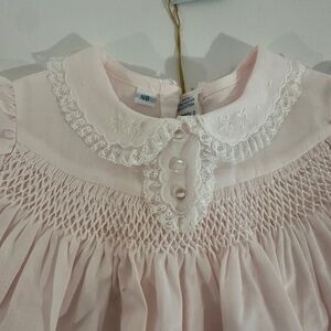Adorable pink baby dress set with delicate lace trim. Perfect for special occasions.