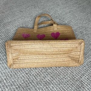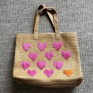 Charming tote bag featuring pink and orange heart designs. Perfect for adding a playful touch to your outfit.