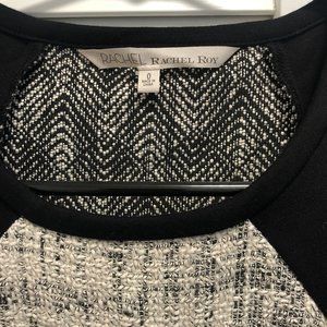 Knee length dress with a cross zipper on the skirt of the dress. Black, Gray & White. Never worn! Size 0
