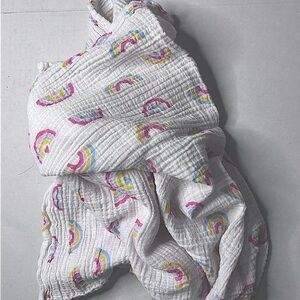 Muslin baby blanket with a rainbow pattern. Pink, yellow, and blue rainbows on a white background. 44x40