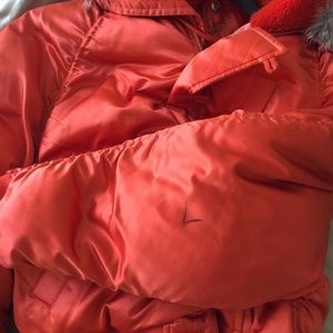 Absolutely Luxurious Item!!! Outside Silk 100%, inside Down 80% And the hood lining is genuine shearling!! With a fur trim! Soft, super warm and Gorgeous!!