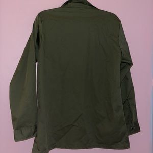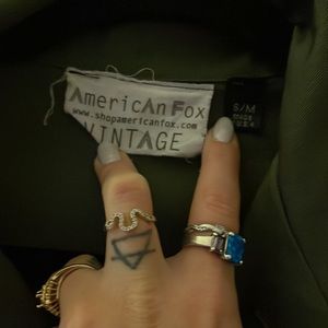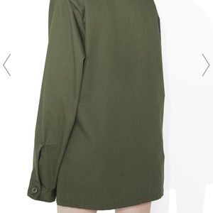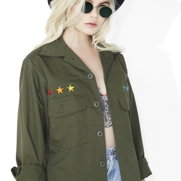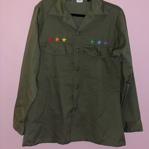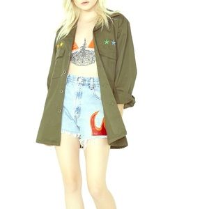 American Works Vintage for Dollskill Reworked rainbow star military jacket featuring a sturdy army green construction, slouchy oversized fit, chest pockets, embroidered rainbow star detailing, and button closure. One size, fits like a S/M
