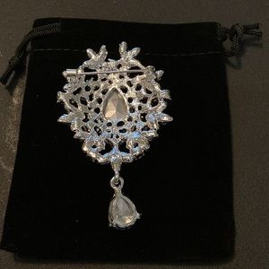 Stunning Rhinestone silver tone metal brooch pin with teardrop rhinestone pendant