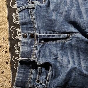 Super comfortable Goode Rider breeches.Denim with lt.brown fabric seat and leg insets.Velcro bottom closure and double hook snap front.Nonslip rear pocket inserts.Good condition.