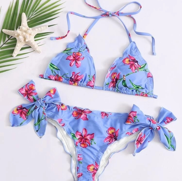 Brand new never worn Hawaiian print bikini. Bottoms tie at sides. Top is super tiny not much coverage at all. Maybe size A or B cup