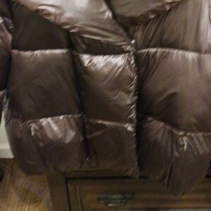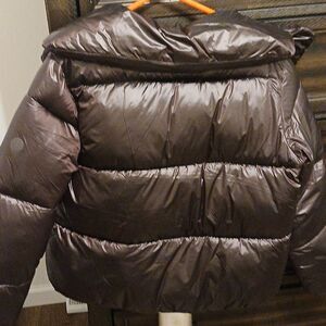This brown puffer jacket features a distinctive quilted pattern that creates a stylish padded look. The prominent stand-up collar provides extra warmth, while the full-length sleeves ensure comfort during colder weather.