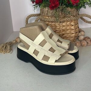 UPPER: Leather woven straps with gore detail in ankle strap.