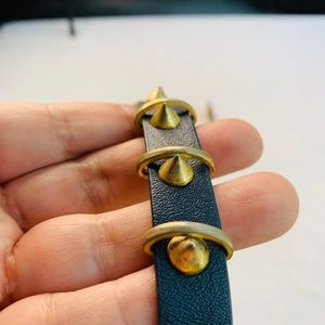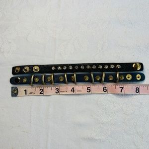 Set of 2 faux leather with gold studs snap on bracelets. Includes one black with gold studs with rhinestones, & one navy blue with gold studs and rings. Both have adjustable snaps. Some discoloration on the hardware on the navy bracelet. See approximate measurement pics. Smoke free home.
