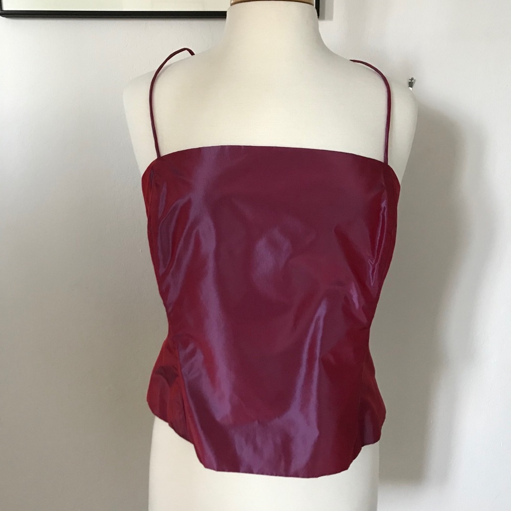 100% Silk taffeta Bustier with spaghetti straps, side zip, & stays. Runs small. Goes with matching skirt and shawl. 14” long not including straps. Also available in a size 2.